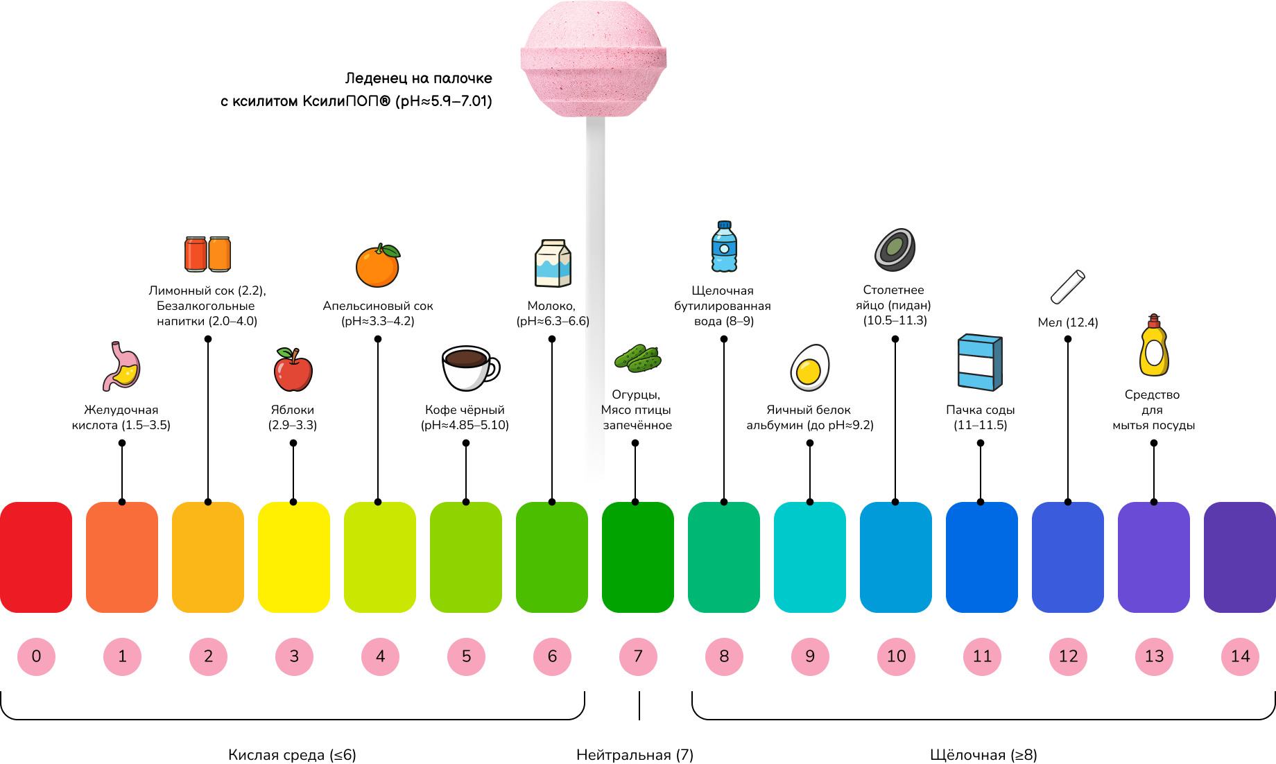 Ориентировочный минимум pH в первые 5–15 минут после приема ксилитового леденца XyliPOP®/КсилиПОП® остаётся нейтральным — не допуская его снижения ниже критического значения 5,6.