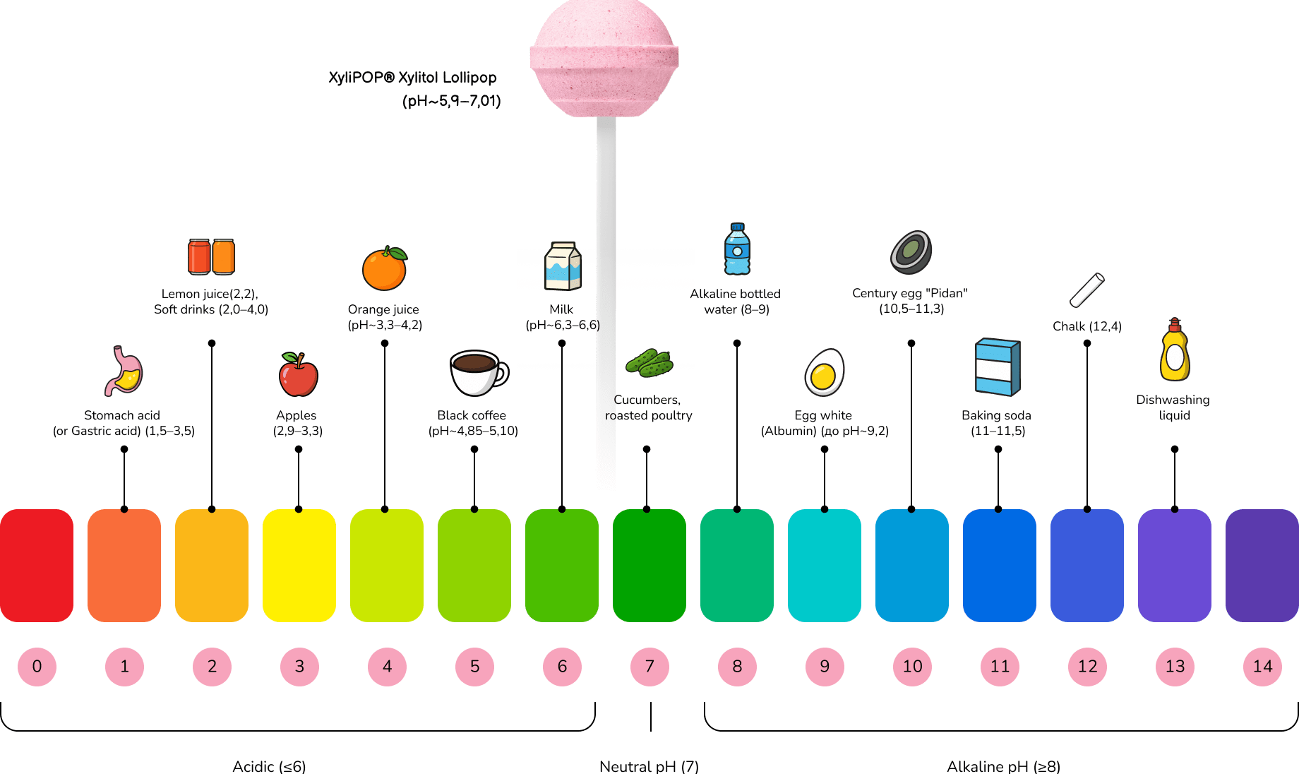 With XyliPOP® lollipops, your mouth’s pH stays at a safe, neutral level during the critical first 15 minutes, preventing the acidity that can damage tooth enamel