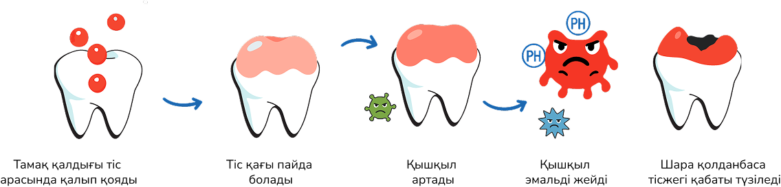 1. Құрамында қант бар өнімдерді жегенде ауыз қуысында қышқыл орта қалыптасады, pH 5,5 мөлшерінен төмен.